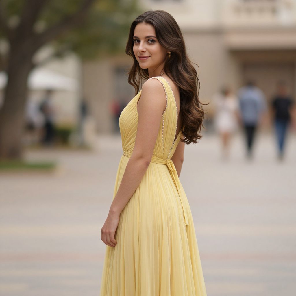 Beautiful gold formal dress, 1girl, solo, dress, long hair, brown hair, yellow dress, flower, arms behind back, looking at viewer, blurry, blurry background, outdoors, smile