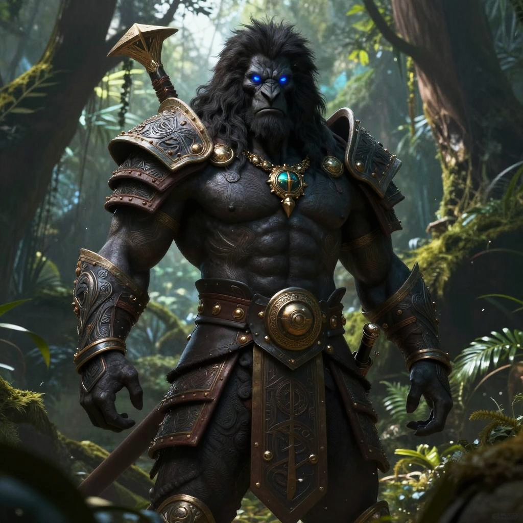 Digital illustration of a muscular, bearded elf with glowing green flames surrounding him, wearing tribal armor and a green gemstone necklace, standing in a lush
