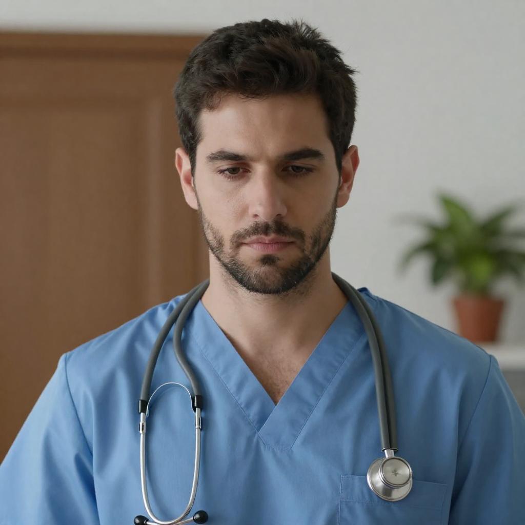Photograph of a bound man with short dark hair, wearing green medical scrubs, sitting on the floor with white tape over his mouth and wrists. Floral wallpaper and a white vase with flowers in the background. Light from the left. Intense, distressed facial expression. Door frame in the foreground.