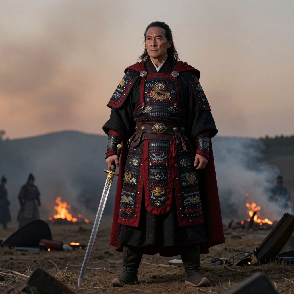 A warrior-man with a weathered face, deep wrinkles, and a calm yet determined gaze, standing on the edge of a battlefield at twilight, dressed in a layered black and red warrior’s cloak with embroidered dragon motifs, his sword resting on the ground as smoke rises from the burning ruins behind him.