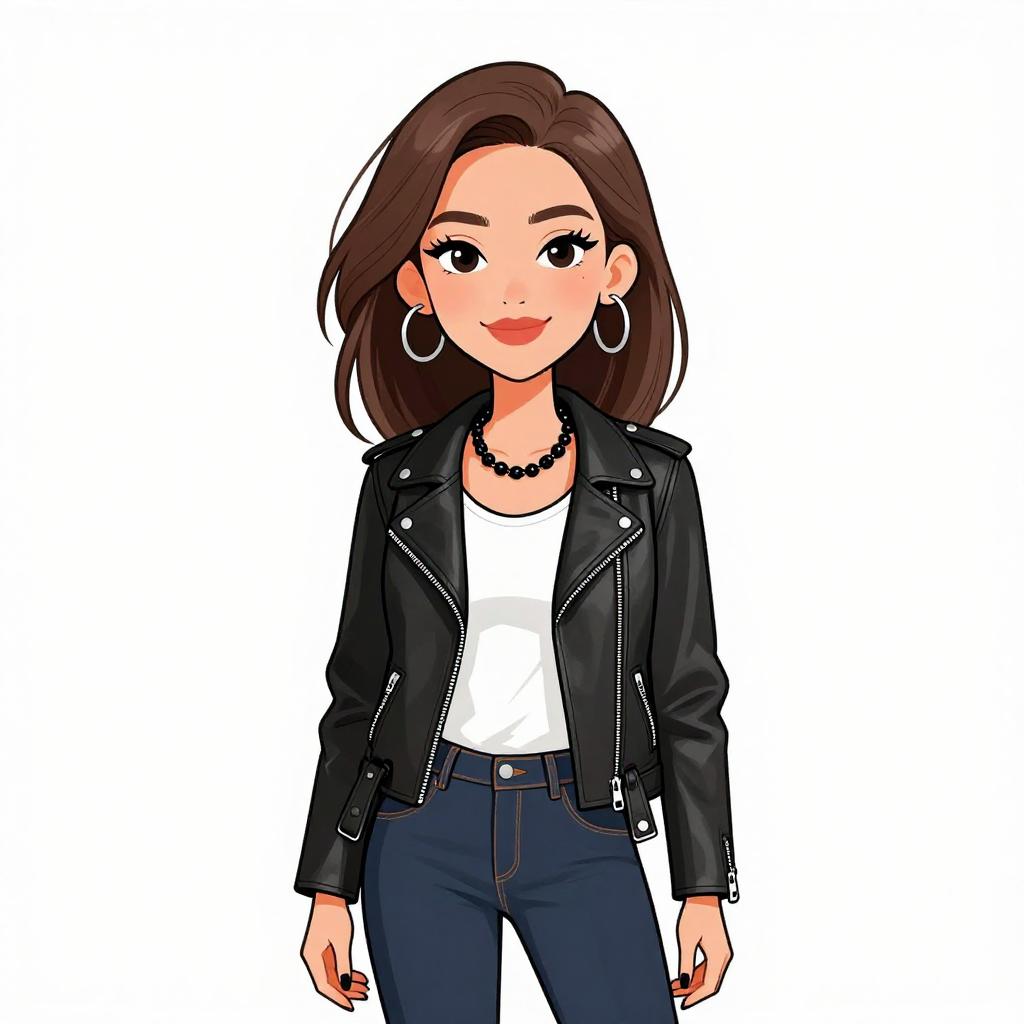 Digital illustration of a young woman with light skin, brown hair, red lipstick, wearing a black leather jacket, white shirt, black pants, hoop earrings