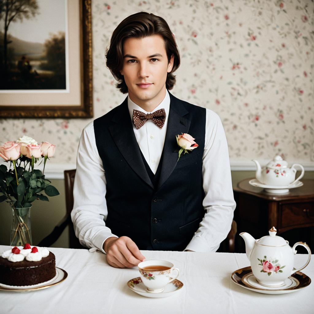 First easter outfit fancy, photo of handsome young man, standing in front of flower arch, period-style outfit, light blue and brown shirt, white cuffs, yellow bow tie, beige pants, brown suspenders, wavy brown hair, serious expression, colorful tulips and eggs in background, daytime, outdoor, soft lighting, natural colors, historical costume, realistic photography style