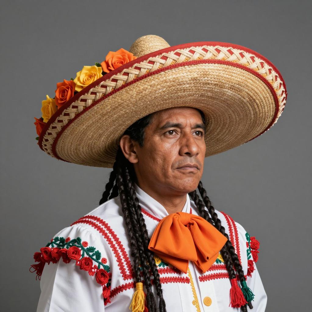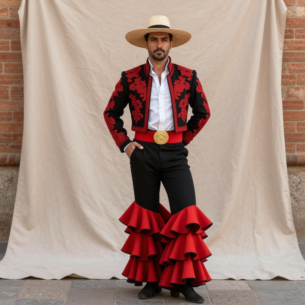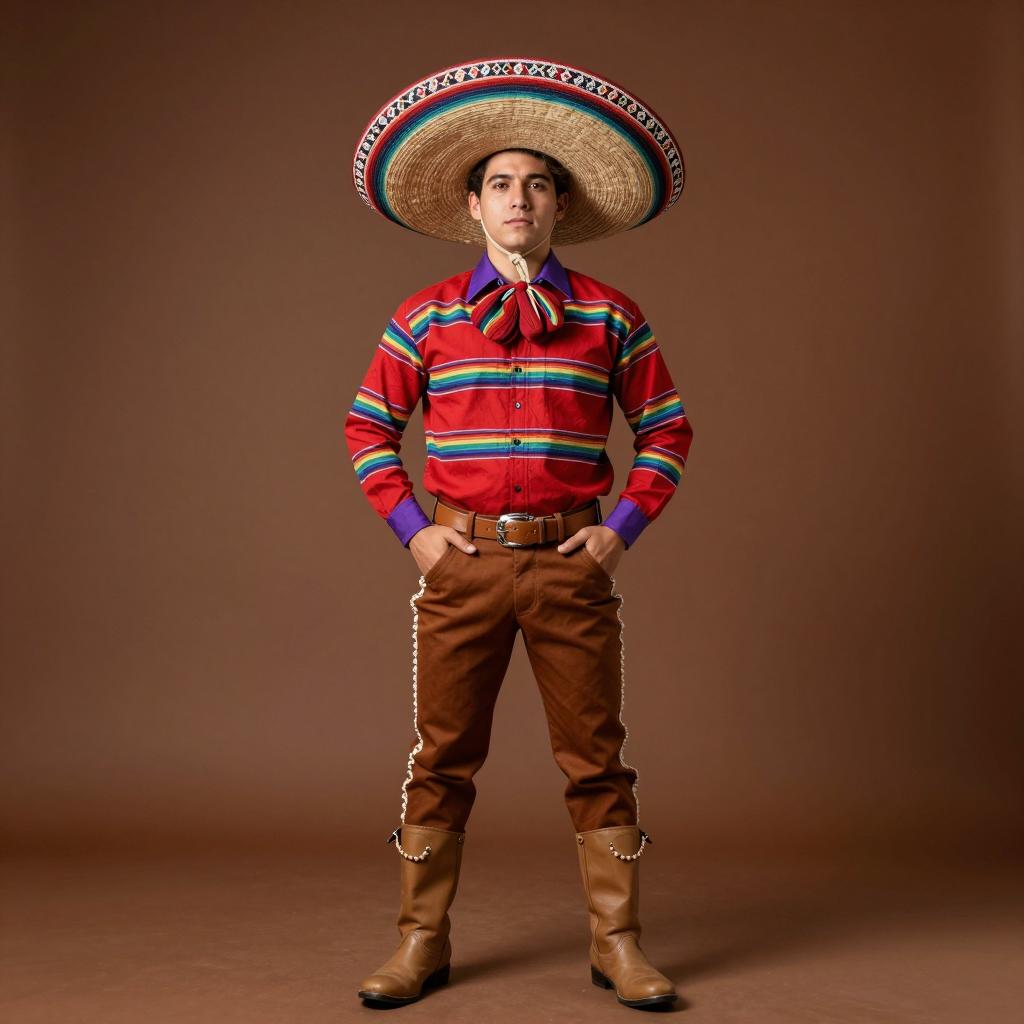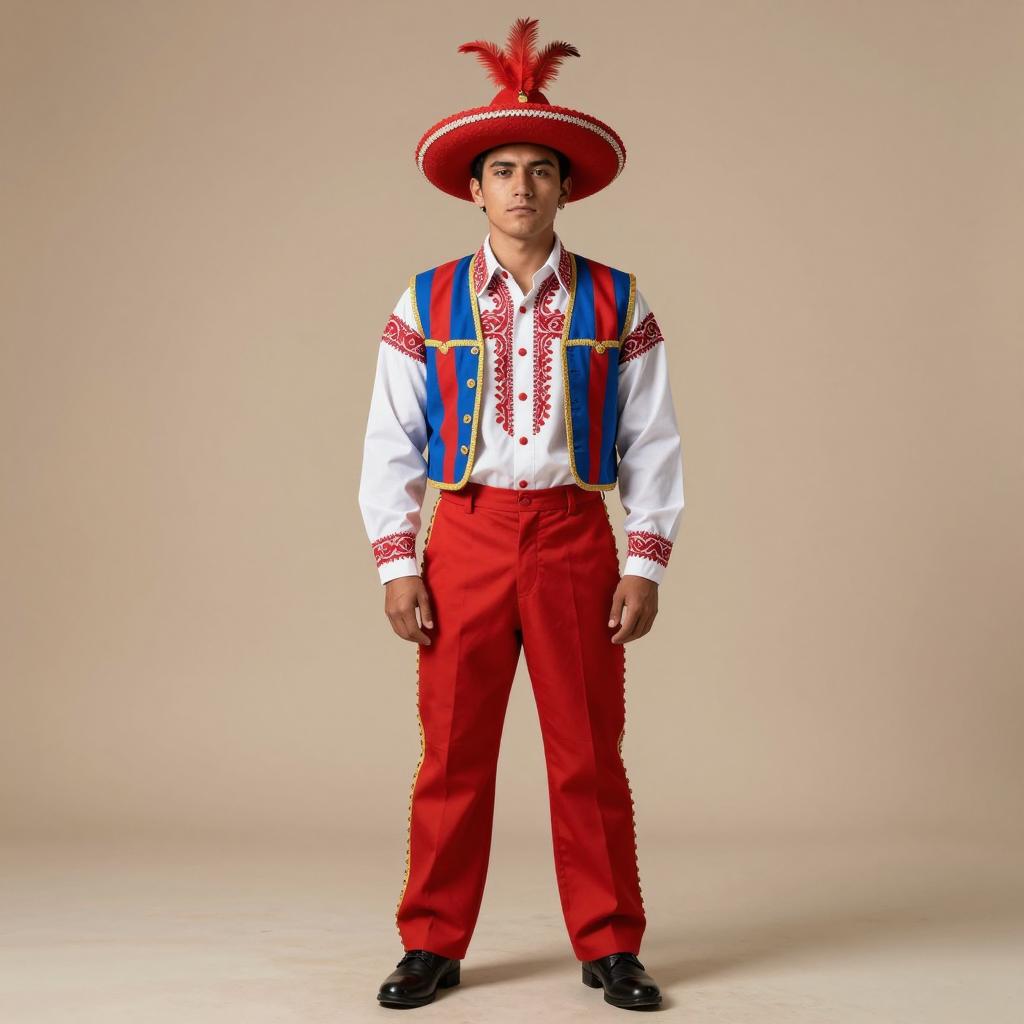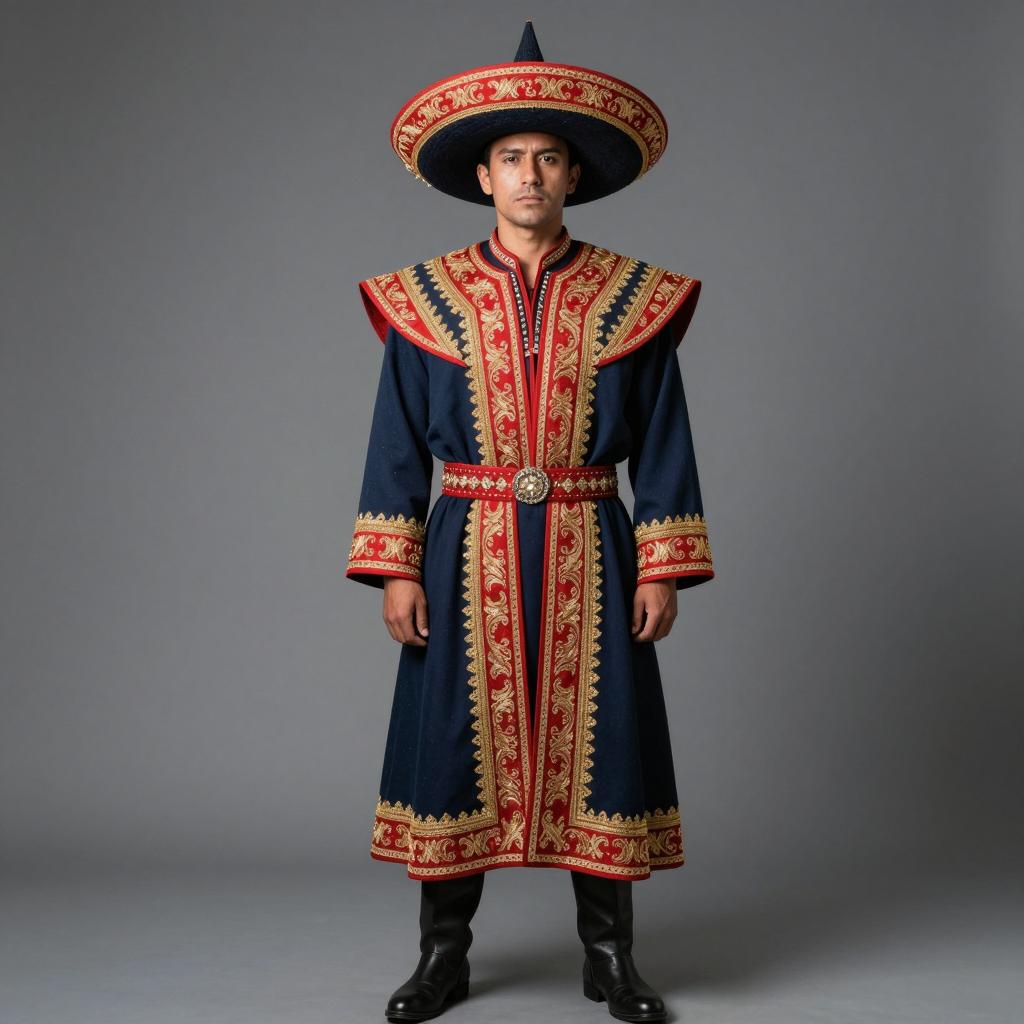 Costume hispanic, photograph of a man, standing, full-body, wearing elaborate traditional costume, detailed outfit with dark blue robe, red and gold embroidery, large ornate hat, serious expression, gray background, studio lighting, realistic, historical clothing, rich ures, symmetrical composition, traditional attire, full view, color photograph, realistic rendering