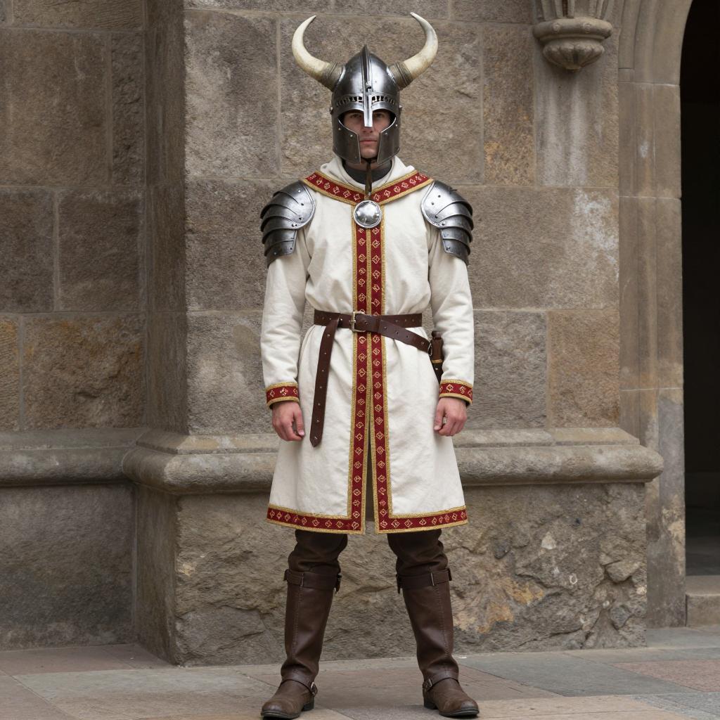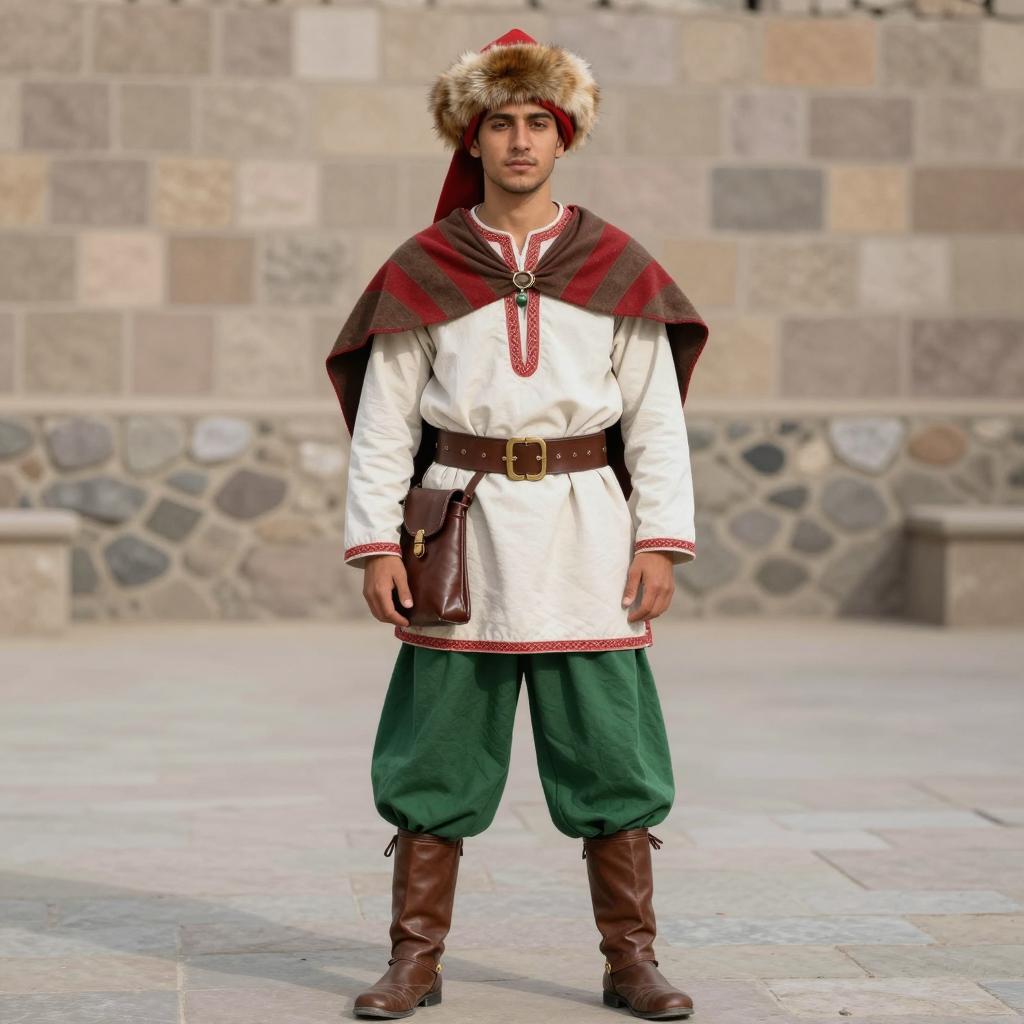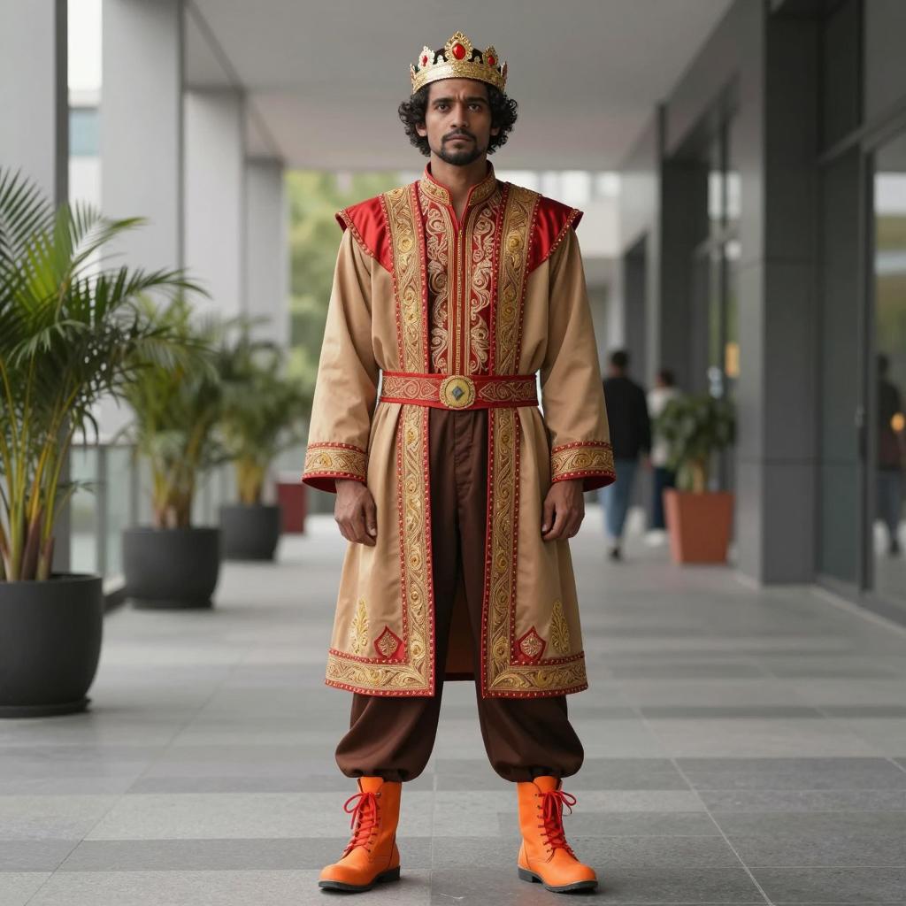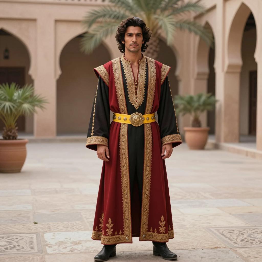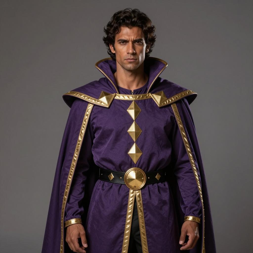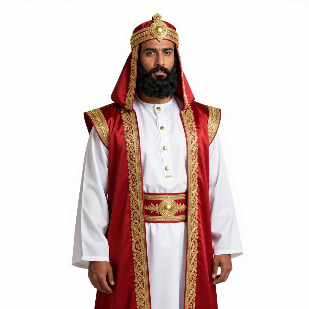 Costume hispanic, photograph of a man, standing, full-body, wearing elaborate traditional costume, detailed outfit with dark blue robe, red and gold embroidery, large ornate hat, serious expression, gray background, studio lighting, realistic, historical clothing, rich ures, symmetrical composition, traditional attire, full view, color photograph, realistic rendering