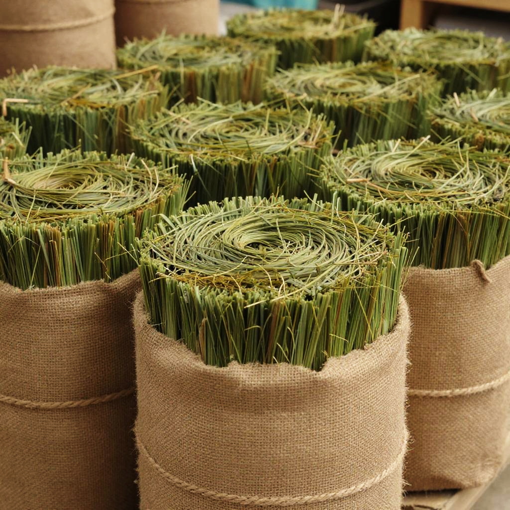 This is a close-up photo of several large, cylindrical bundles of green, grass-like material wrapped in rough, brown burlap. The bundles are stacked on top of each other in neat rows, creating a textured and natural-looking appearance. The green material inside contrasts with the coarse texture of the burlap, giving the image a rustic, organic feel. The background is slightly blurred, focusing attention on the bundles.
