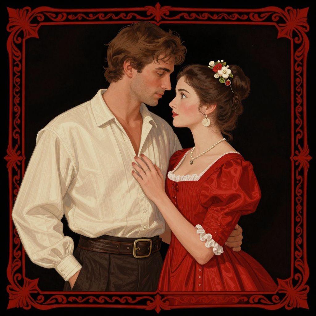 Romantic illustration depicts two individuals in period attire, a man in a cream shirt and a woman in a red dress adorned with a floral accessory, framed by an ornate red border against a dark background.