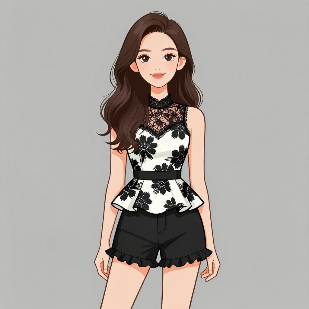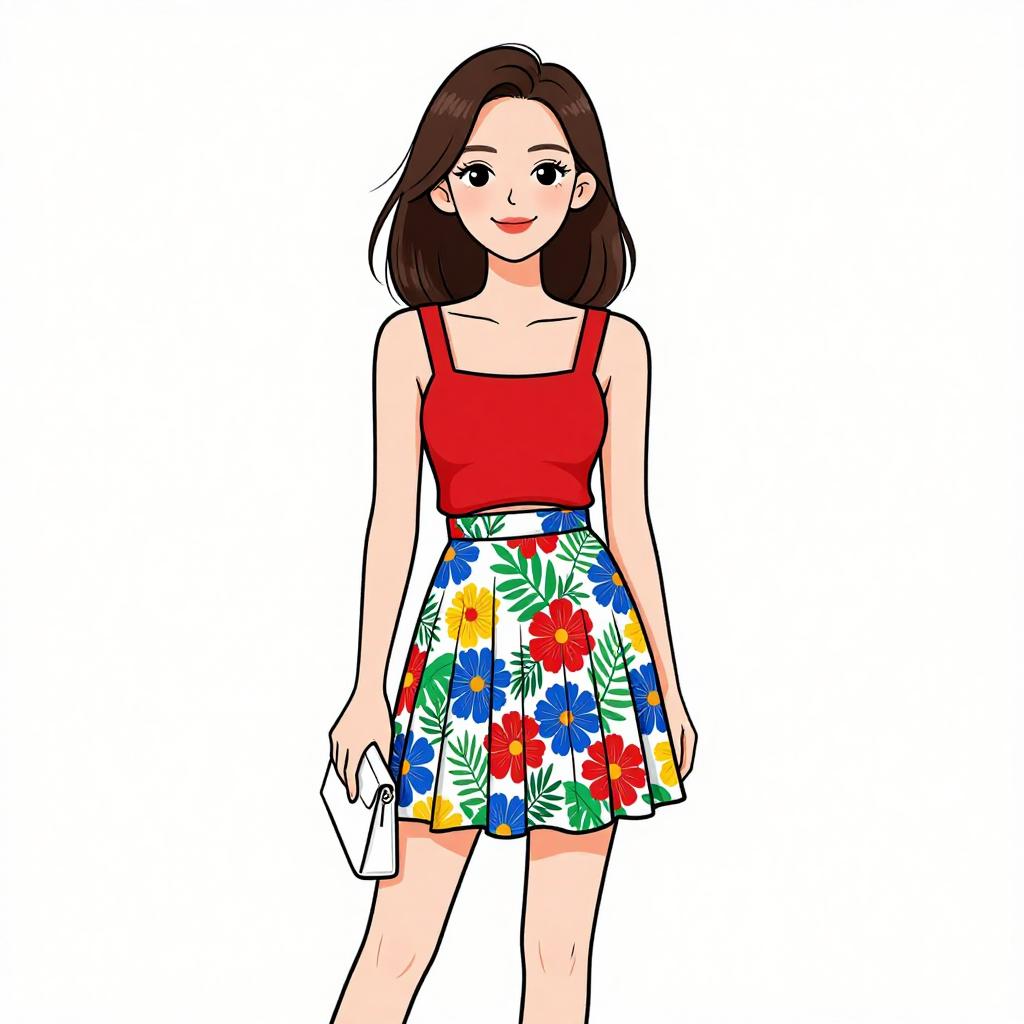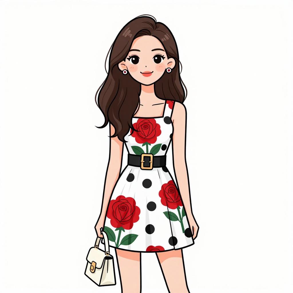 Illustration of a young woman with long brown hair and a pretty face, wearing a sleeveless mini dress featuring a white background with large red rose and black polka dot print. The dress has a square neckline, wide black belt with a large buckle, and a pleated skirt. She is accessorized with stud earrings and holding a structured white handbag.