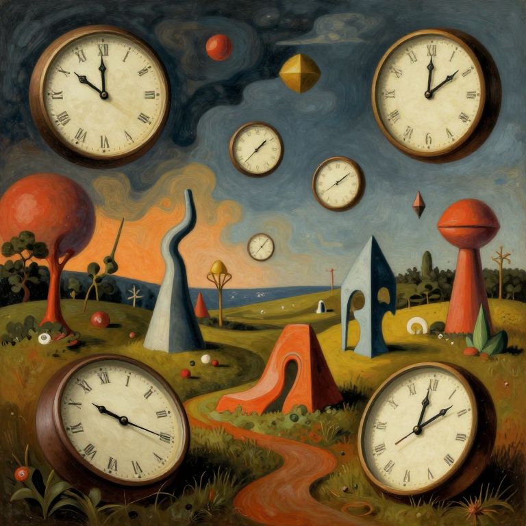 Surrealist painting: Clock faces float above bizarre, red and blue abstract structures in a grassy, twilight landscape with colorful skies and scattered orbs.