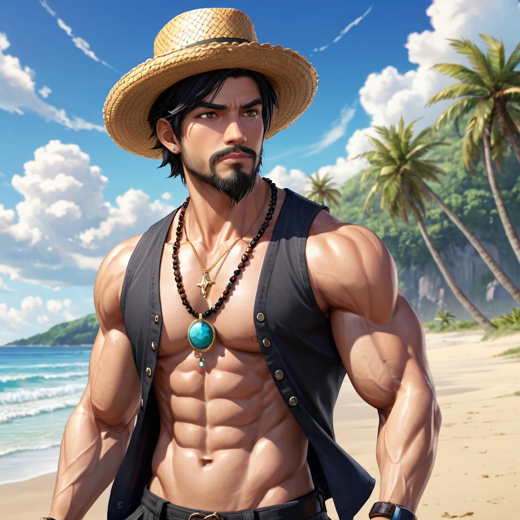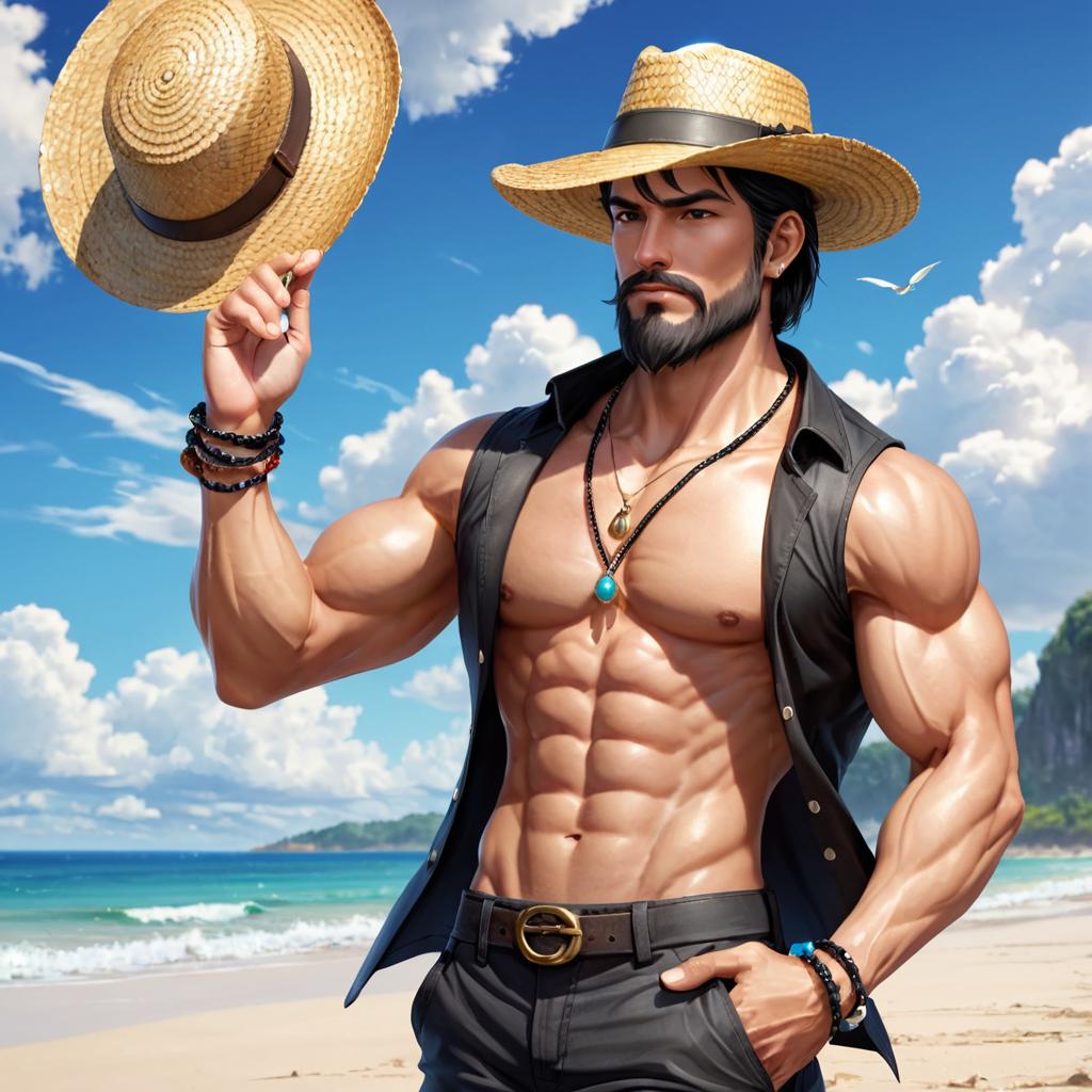 1boy, male focus, solo, topless male, hat, outdoors, facial hair, black hair, realistic, pants, day, holding, necklace, straw hat, abs, sky, jewelry, cloud, beach, manly, muscular, holding clothes, beard, shirt, pectorals