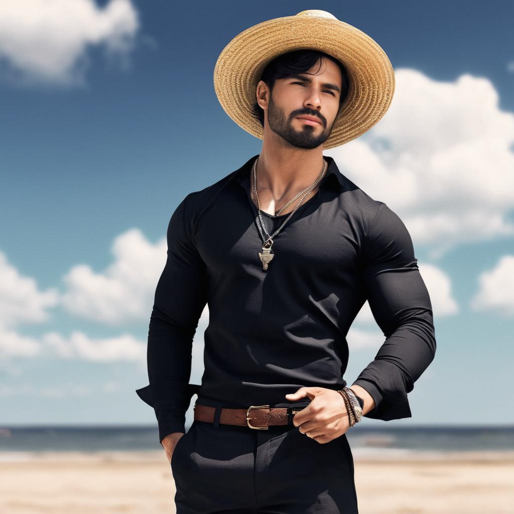 Stylish young man standing on a sandy beach near the ocean, wearing a blue shirt over a t-shirt, dark pants, a straw hat, and various necklaces and bracelets. The background features blue sky with large clouds and a distant forest coastline.