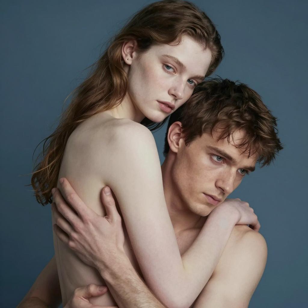 Photograph of two people in an intimate embrace. A topless woman with pale skin and long brown hair leans over a man with short brown hair and a focused expression. The man's hands grip her back. Blue background.