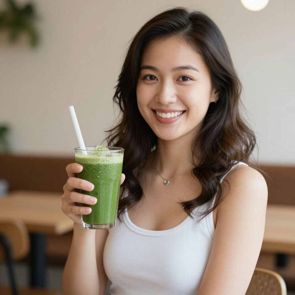 Photograph of a smiling young woman with wavy, dark brown hair, wearing a white tank top and small gold necklace. She holds a green smoothie with a white straw in her right hand, positioned in the foreground. Her skin is fair, and she has brown eyes. The blurred background features a modern cafe with shelves and a counter. The smoothie has visible green specks, likely from spinach or kale. The image is brightly lit with natural light, emphasizing her cheerful expression and casual, relaxed vibe.