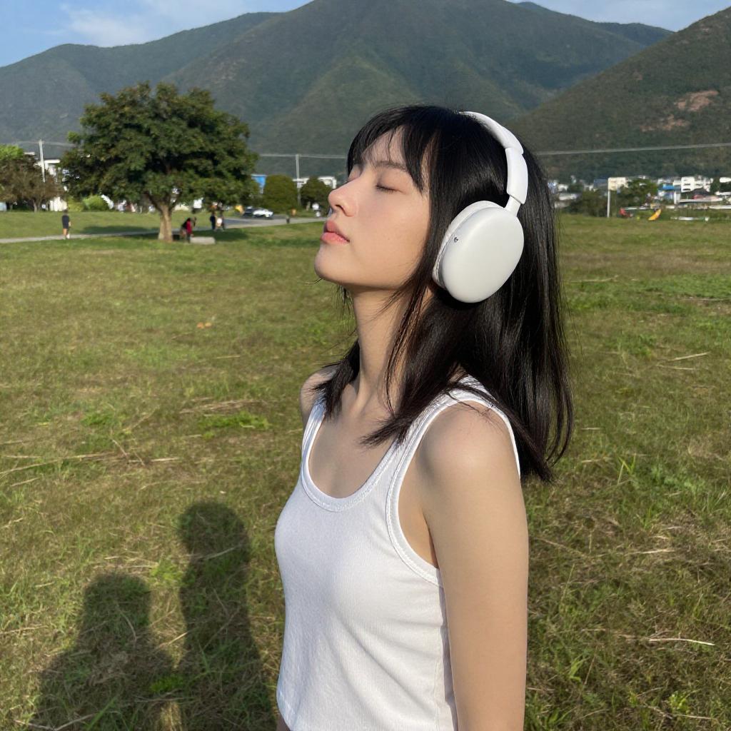 Sam yang, 1girl, black hair, breasts, closed eyes, closed mouth, day, grass, headphones, lips, long hair, mountain, outdoors, profile, shadow, small breasts, solo, tree