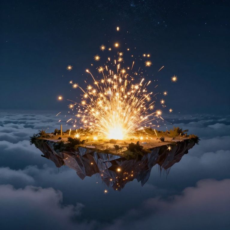 Photograph of a floating island at night, illuminated by a bright, sparkling firework explosion, surrounded by clouds in a starry sky.