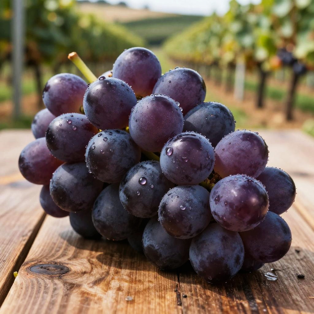 Largest grape in the world, a giant, plump purple grape resting on a rustic wooden table, detailed texture, soft sunlight illuminating the dew drops on its surface, hyper-realistic, nature-inspired background with vineyard rows fading into the distance