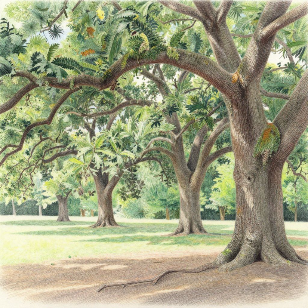 Highly detailed colored pencil drawing of a sunlit clearing surrounded by ancient oak trees with sprawling branches. The image captures intricate bark textures and layered foliage under soft natural light, emphasizing the tranquil atmosphere of the natural woodland setting.