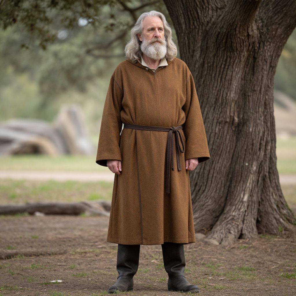 This photograph depicts an elderly white man with a long, white beard and shoulder-length gray hair, standing in a wooded area. He wears a brown, long-sleeved tunic with a black belt tied at the waist and black pants. His feet are clad in black boots. The background features a large tree trunk on the right and blurred greenery and rocks in the distance. The man's expression is serious, and the lighting is natural, highlighting the textures of his tunic and the tree bark. The overall atmosphere evokes a medieval or historical setting.