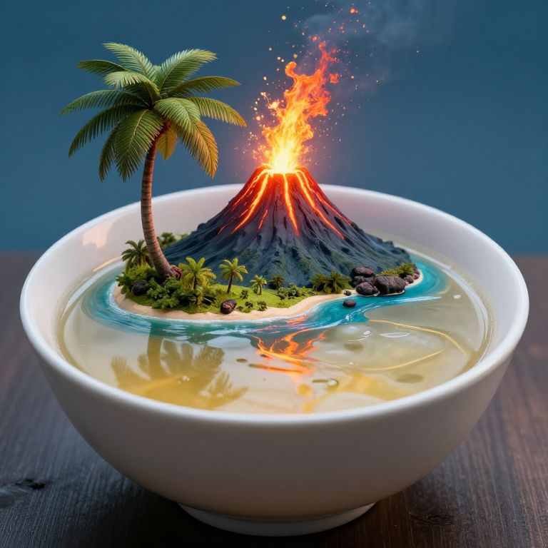 Photograph of a surreal scene: a white ceramic bowl filled with clear, yellow-tinted liquid, resembling a small island. The island has a single palm tree, green grass, and rocks, with a miniature volcano erupting bright orange flames and sending smoke into the air. The volcano is positioned at the center of the island, surrounded by a calm blue water ring. The background is a solid dark blue, and the bowl rests on a dark wooden surface. The image blends realistic elements with whimsical fantasy, creating a striking visual contrast.