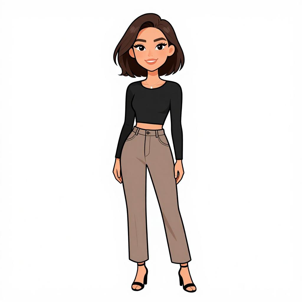 Digital illustration of a smiling young woman with light skin, brown hair, wearing a navy top, black-and-gray checkered pants, and black shoes.