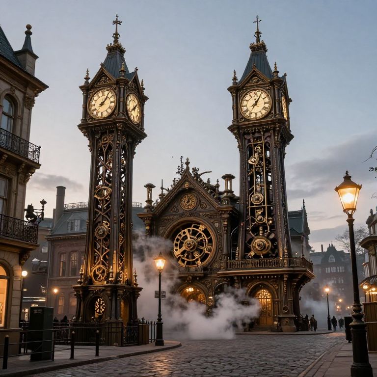 Victorian steampunk architecture featuring ornate ironwork, large clock towers with exposed mechanical elements, smoky steam clouds, cobblestone streets and gas lamps at twilight