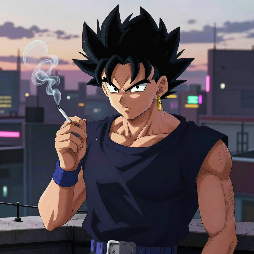 A detailed digital painting of Vegito with his iconic hair and fusion earrings, casually smoking a cigarette on a rooftop at dusk, gritty city backdrop, neon lights reflecting in his eyes, smoky atmosphere, anime-inspired art with a modern twist.