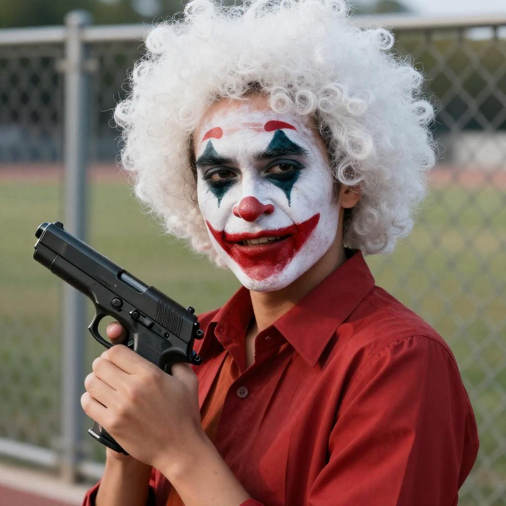 Photograph of a person with a white afro wig, painted clown face with dark eye makeup and red blood, sharp teeth, wearing a red pleated shirt, holding a black handgun. Behind them is a chain-link fence and grass.