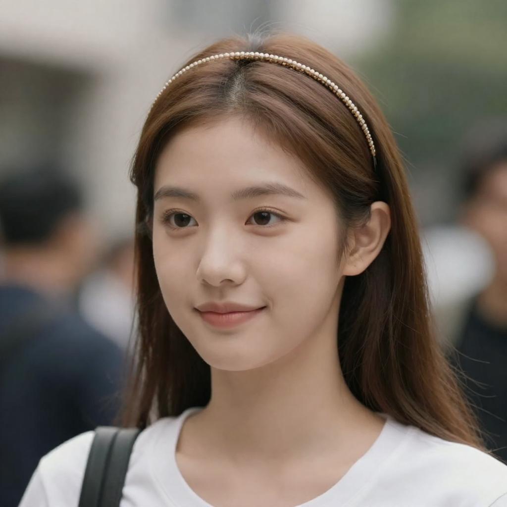 Close-up portrait of a young woman with light brown hair styled with a thin, beaded headband. She has light skin and is wearing a simple white top. The background is softly blurred, emphasizing her calm expression and slight smile.