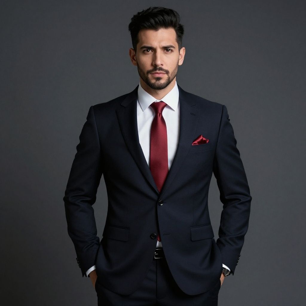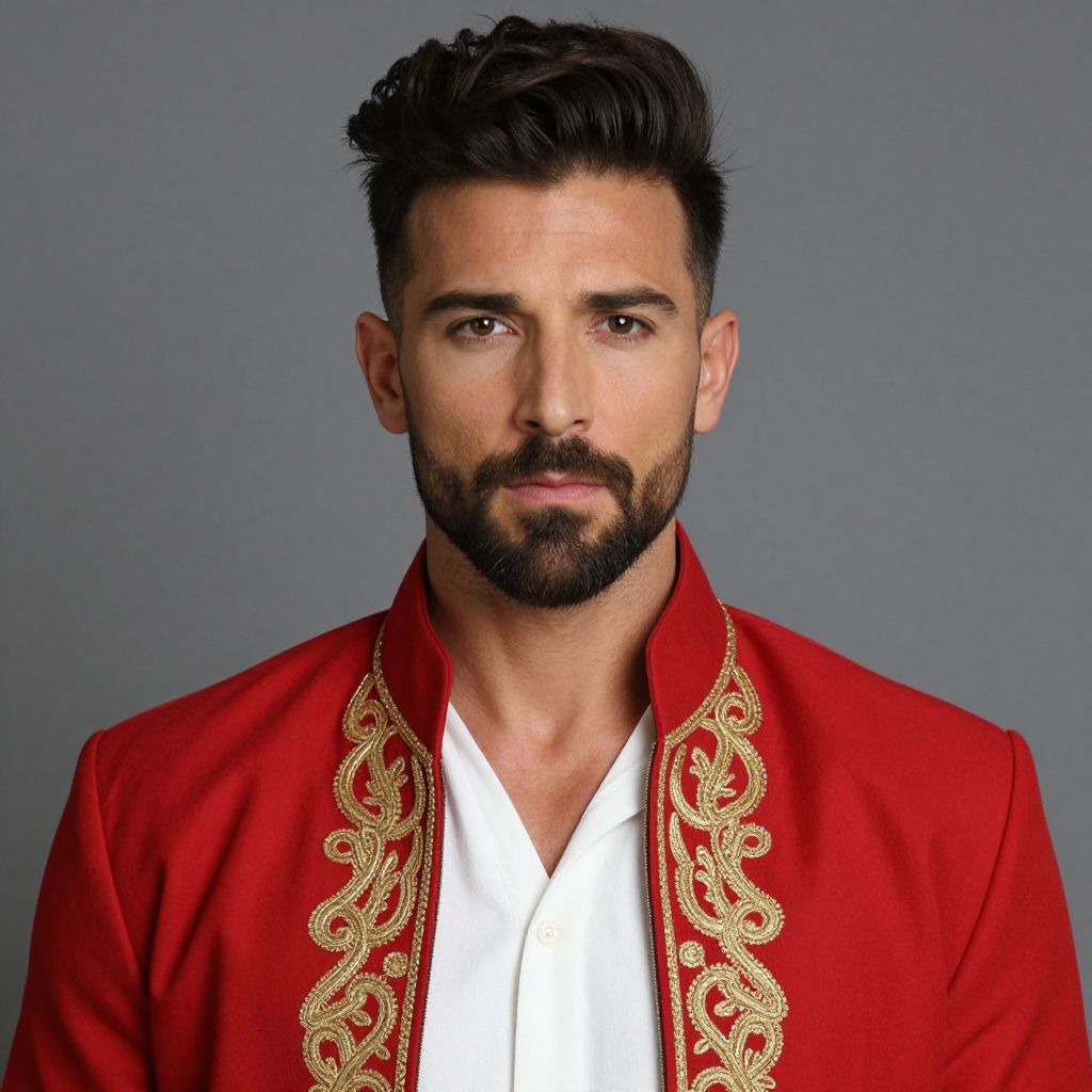 Photograph of a handsome man with olive skin and dark, neatly styled hair and beard. He's wearing a vibrant red jacket adorned with gold embroidery along the edges, over a white shirt. His expression is neutral, and he's centered against a plain gray background. The lighting is even, highlighting his facial features and the rich texture of his jacket.