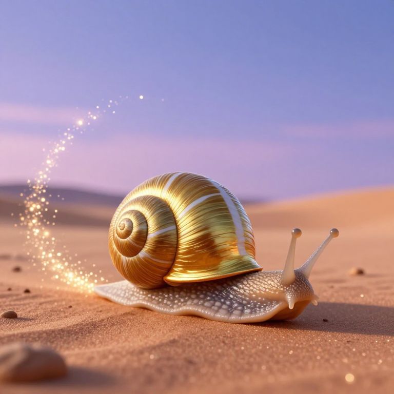 A vibrant 3D-rendered snail with a golden shell adorned in white stripes glides across a shimmering desert landscape, leaving a sparkling trail of stardust against a serene twilight sky, evoking a whimsical and otherworldly atmosphere.