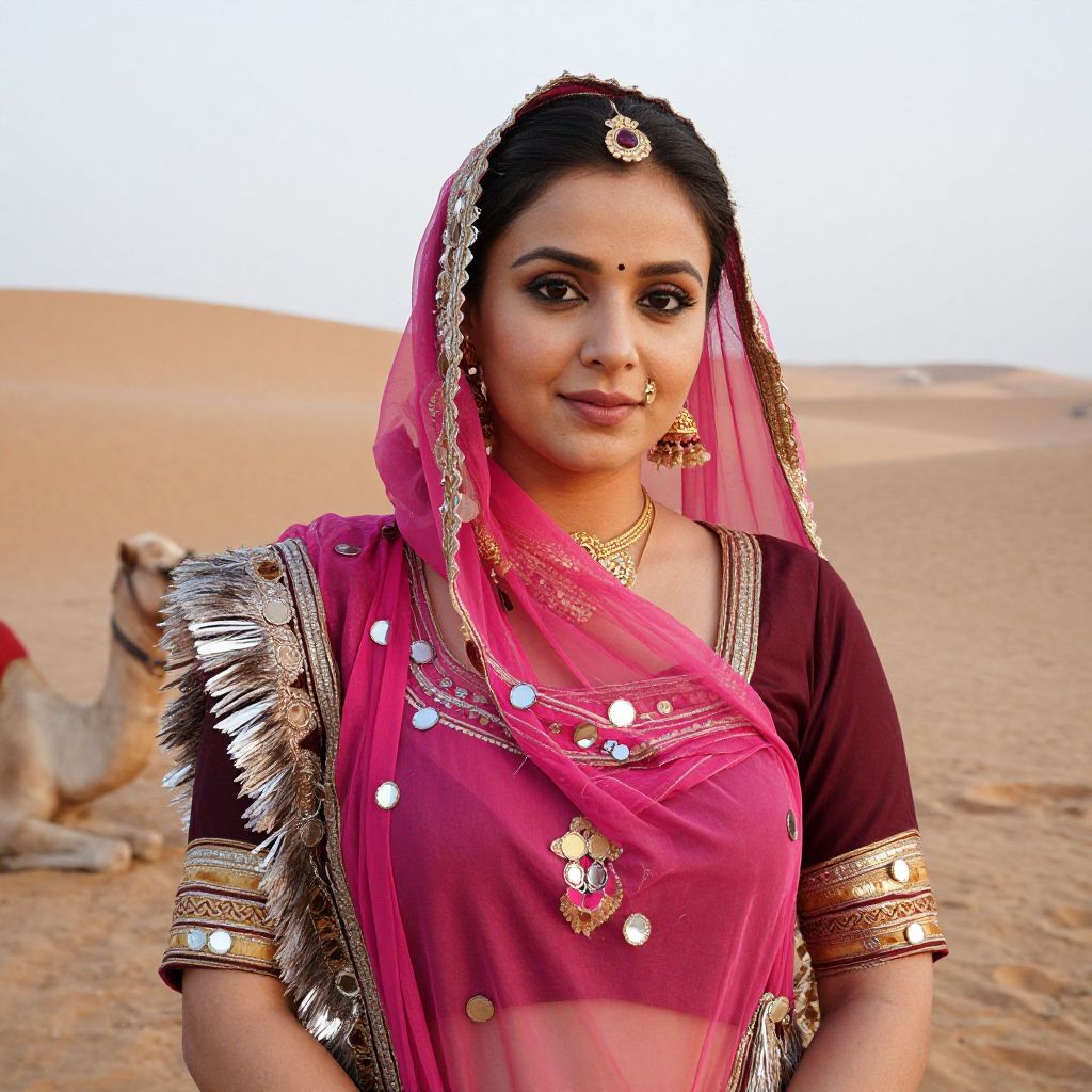 A detailed and natural-looking portrait of a woman in a Rajasthani dress costume, with a bright pink and maroon saree-style dhoti with intricate mirror work, standing outdoors in a desert landscape near Pushkar, with sand dunes in the background and a camel resting nearby, her face has soft, warm features with gentle, expressive eyes and fair skin.. The woman has big tits and cute face