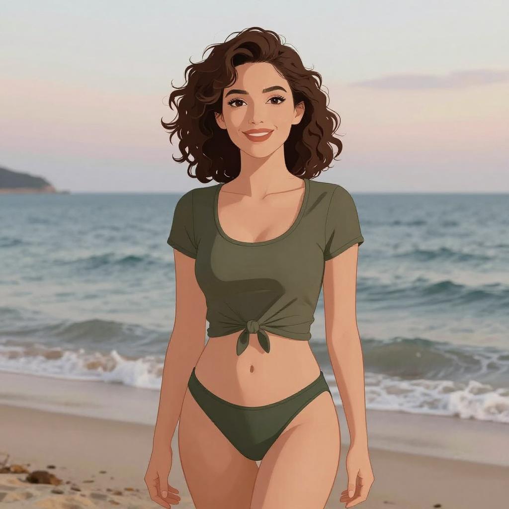 Woman with pretty face and pretty hair. smiling Woman, beachwear with a hint of military inspiration, olive green mesh t-shirt tied at the waist, scoop neckline, short sleeves, forest green high-cut swimsuit bottom, natural curly hair, subtle makeup, beach background with calm ocean and twilight sky. --sref 1467