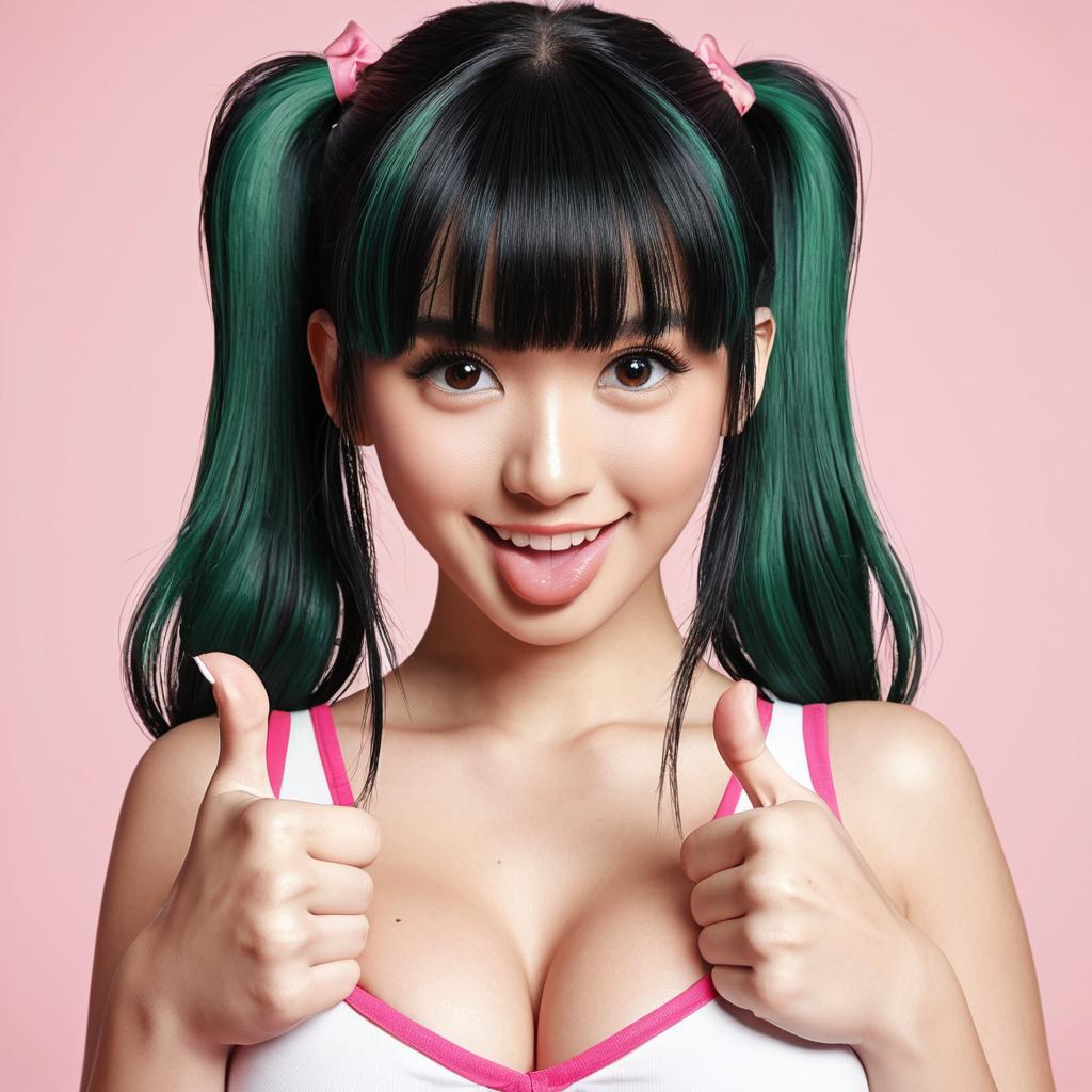Score_9, score_8_up, score_7_up, 1girl, ponytail, bangs, black hair, pink IncursioDipDyedHair, green eyes, awe, heart, breast press, (biting own lip:0.6), thumbs up, blush