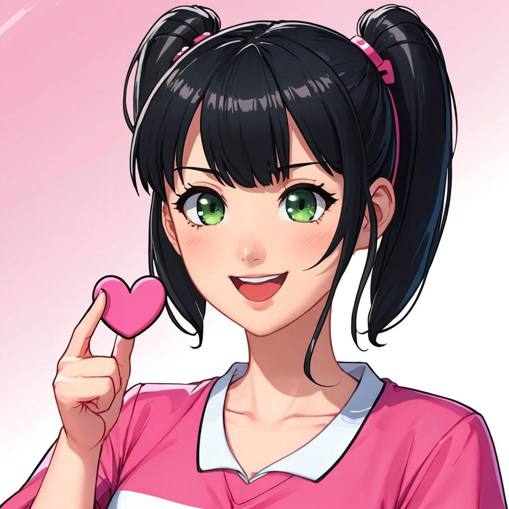 Anime-style digital drawing of a cute, smiling girl with green eyes, black twin-tails, pink hairband, holding a pink heart, wearing a