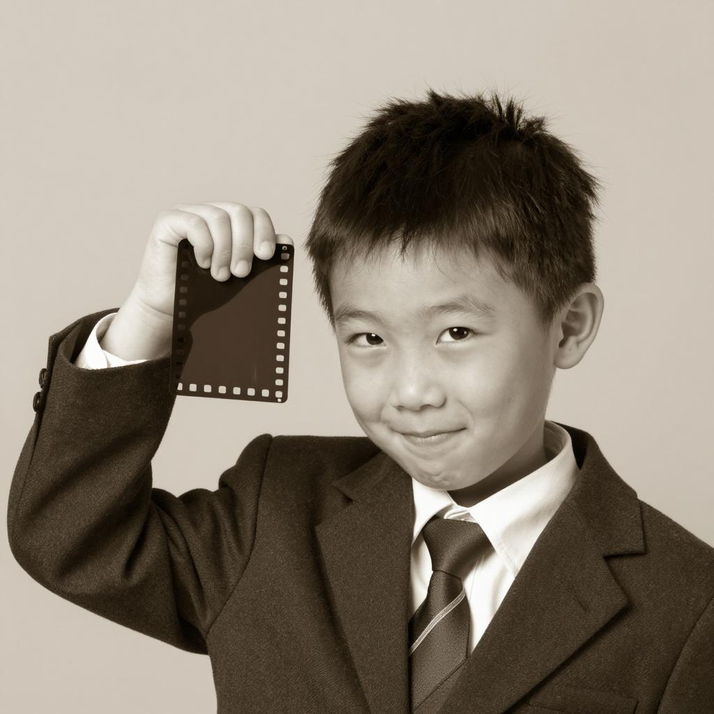Photograph of a young boy with short dark hair, wearing a dark suit and tie, holding a film strip with a curved end, smiling slightly to the right. Sepia-toned background. Boy's left hand gripping film strip above head.
