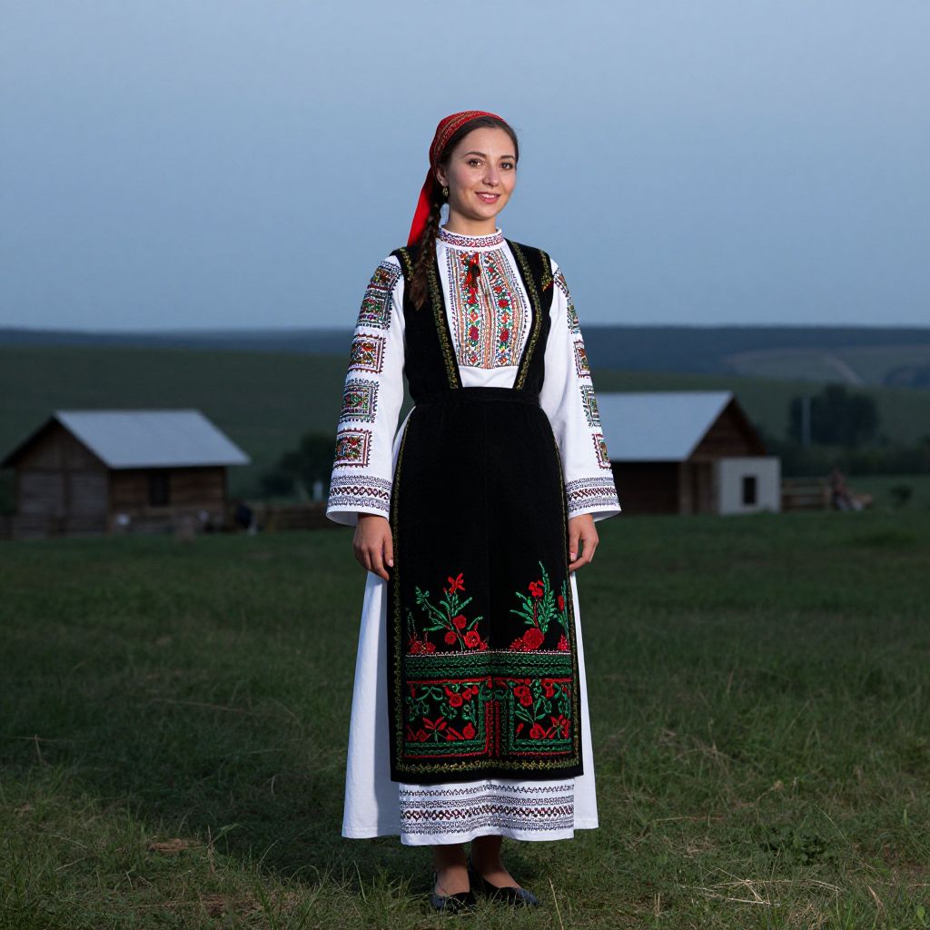 Serbian Folk Costume, woman in a traditional dress standing in a rural area