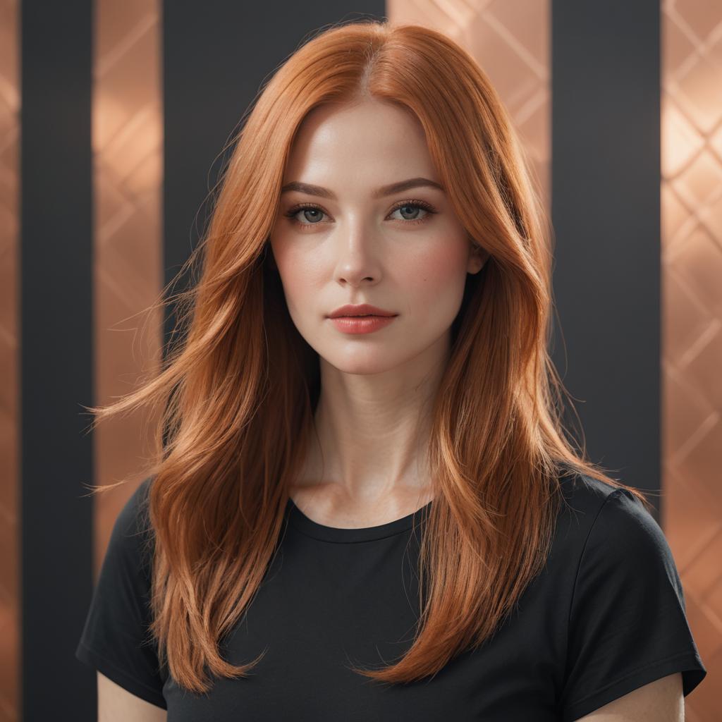 A three-quarter shot, focus on walking motion. The subject features bright copper-colored long hair with blunt ends. A neutral, gentle expression is captured. The subject wears a simple fitted black t-shirt. The background is an abstract geometric background in pastel colors. Natural daylight lighting, depth of field, photorealistic, 8k, highly detailed hair texture.