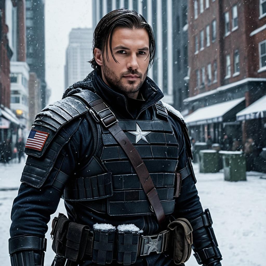 Photorealistic portrait of a male winter soldier standing in a snowy urban environment. The subject has long brown hair, a slight beard, and wears a black leather tactical uniform with armor, including a chest plate with a star insignia and an American flag patch on the shoulder. The outfit features black gloves, utility belt with tactical pouches, and rugged gear suitable for winter conditions. The setting is a snow-covered city street with tall buildings and blurred people in the background, highlighting a gritty and cinematic atmosphere.