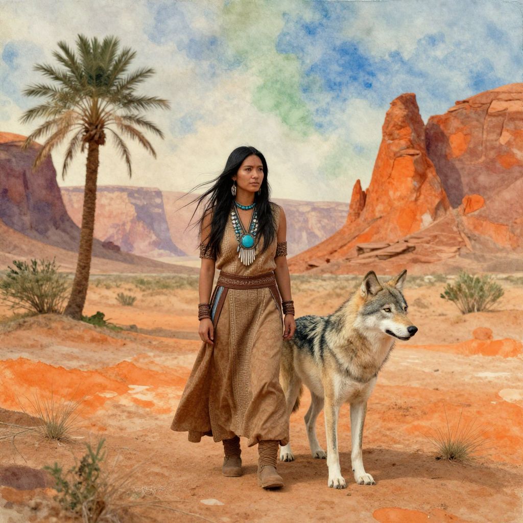 The image is a vibrant and dynamic painting by Fritz Scholder, featuring a striking horse and a native woman. The horse, painted in bold, contrasting colors of black and purple, stands majestically in the foreground, its long, flowing mane adding a sense of movement and grace. The woman, adorned in a colorful, patterned outfit with red, white, and blue hues, stands to the right of the horse, her presence complementing the horse's powerful stance. The background is a lush, golden field that stretches out to meet a blue sky, creating a striking contrast with the subjects. The overall composition is balanced, with the horse and woman positioned centrally, drawing the viewer's eye through the scene. The interplay of colors, textures, and shapes creates a vivid and engaging visual experience, capturing the essence of the subjects and their environment.