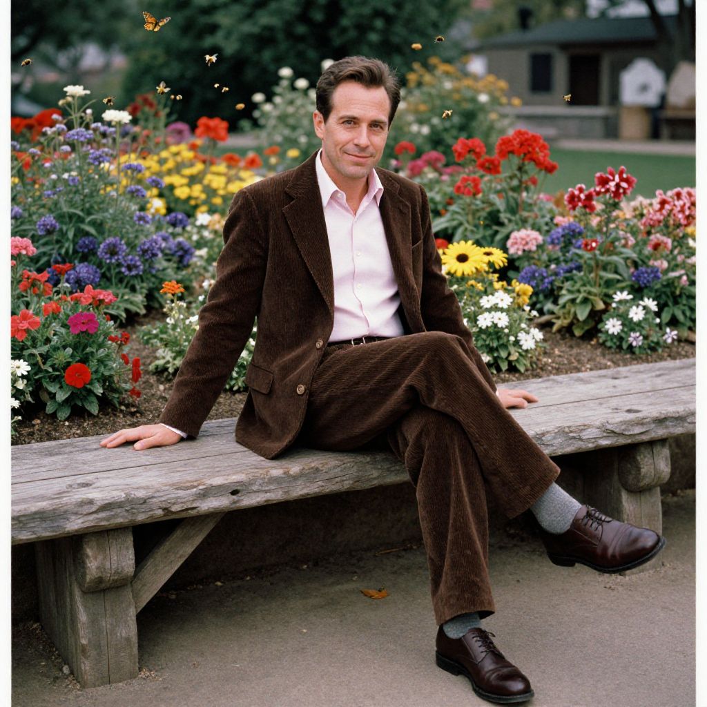 Photograph of a middle-aged white man with short, dark brown hair, sitting on a wooden bench in a vibrant garden. He wears a brown corduroy suit with a white dress shirt, grey socks, and black shoes. The garden behind him is filled with colorful flowers in red, yellow, white, and blue. He has a slight smile and his right hand rests on the bench while his left hand is on his knee. The background includes blurred greenery and a building. The image has a natural, slightly nostalgic feel.