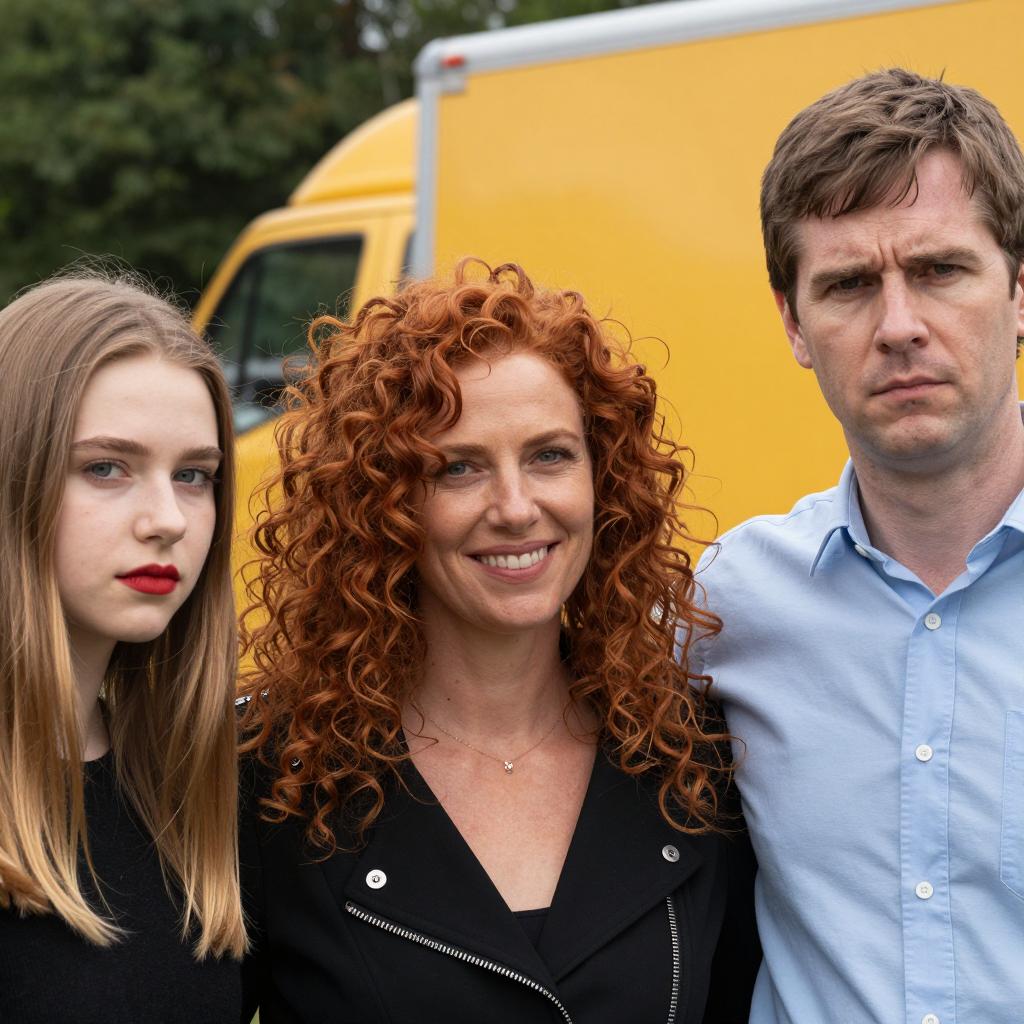 Three people outdoors. Center woman with curly red hair, smiling, wearing black jacket. Right man with short brown hair, pale skin, wearing light blue shirt, neutral expression. Left girl with straight blonde hair, red lips, partially visible. Yellow truck in background, dark green foliage on left. All standing close together.