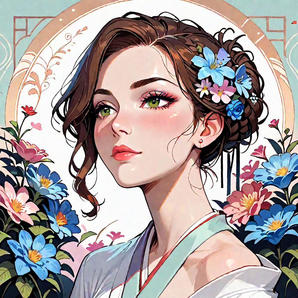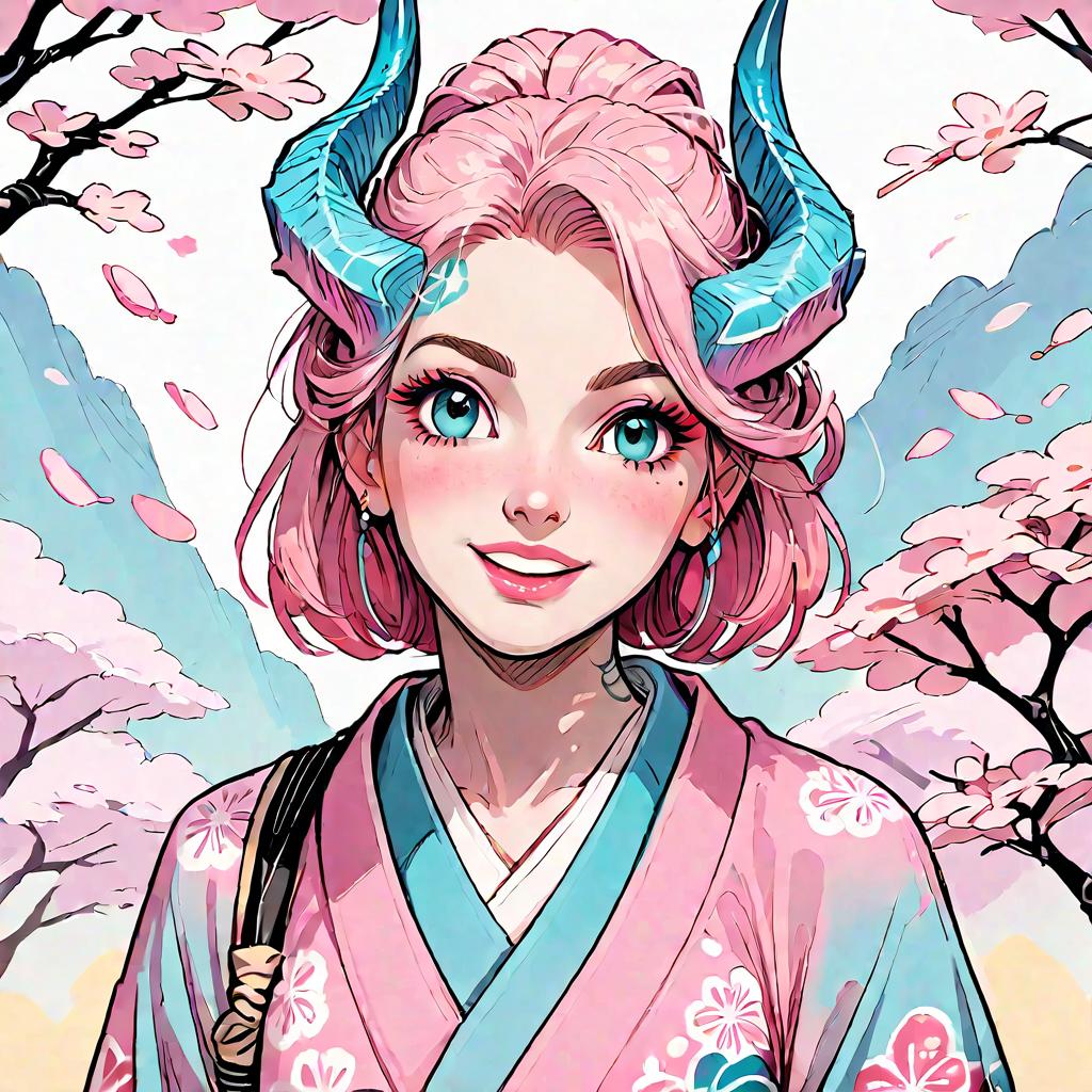 Anime Girl in Pink Kimono with Blue Horns