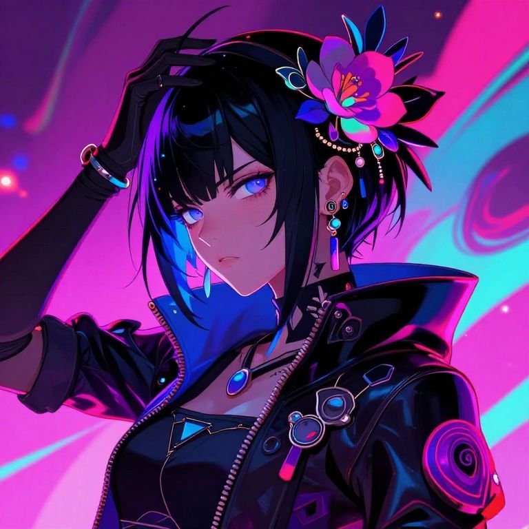 Digital anime-style artwork depicting a young woman with short black hair, adorned with a large pink and purple flower and pearl accessories. She has striking blue eyes and wears a black leather jacket with metallic embellishments, a blue bow at the neck, and black gloves. Her expression is confident and slightly alluring. The background features vibrant neon pink, blue, and purple hues with swirling patterns, adding a futuristic vibe. The character's jewelry includes a blue pendant and earrings, enhancing her edgy, stylish appearance. The lighting and color gradients emphasize her dark hair and pale skin.