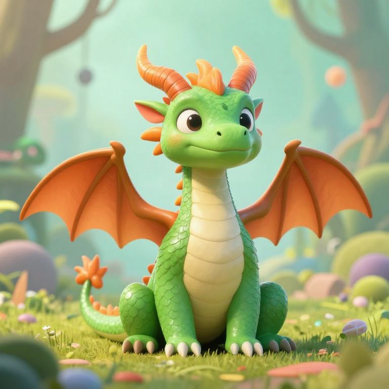 A whimsical, anthropomorphic dragon with vibrant green scales, orange-tipped horns, and playful orange wings sits serenely, exuding charm and wonder in a dreamlike, otherworldly realm.