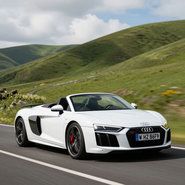 White Audi R8 Spyder convertible cruising along a scenic road, featuring sleek aerodynamic design, vibrant red brake calipers, and a license plate reading \"W.HZ B6F9,\" set against a backdrop of rolling green hills under a partly cloudy sky.