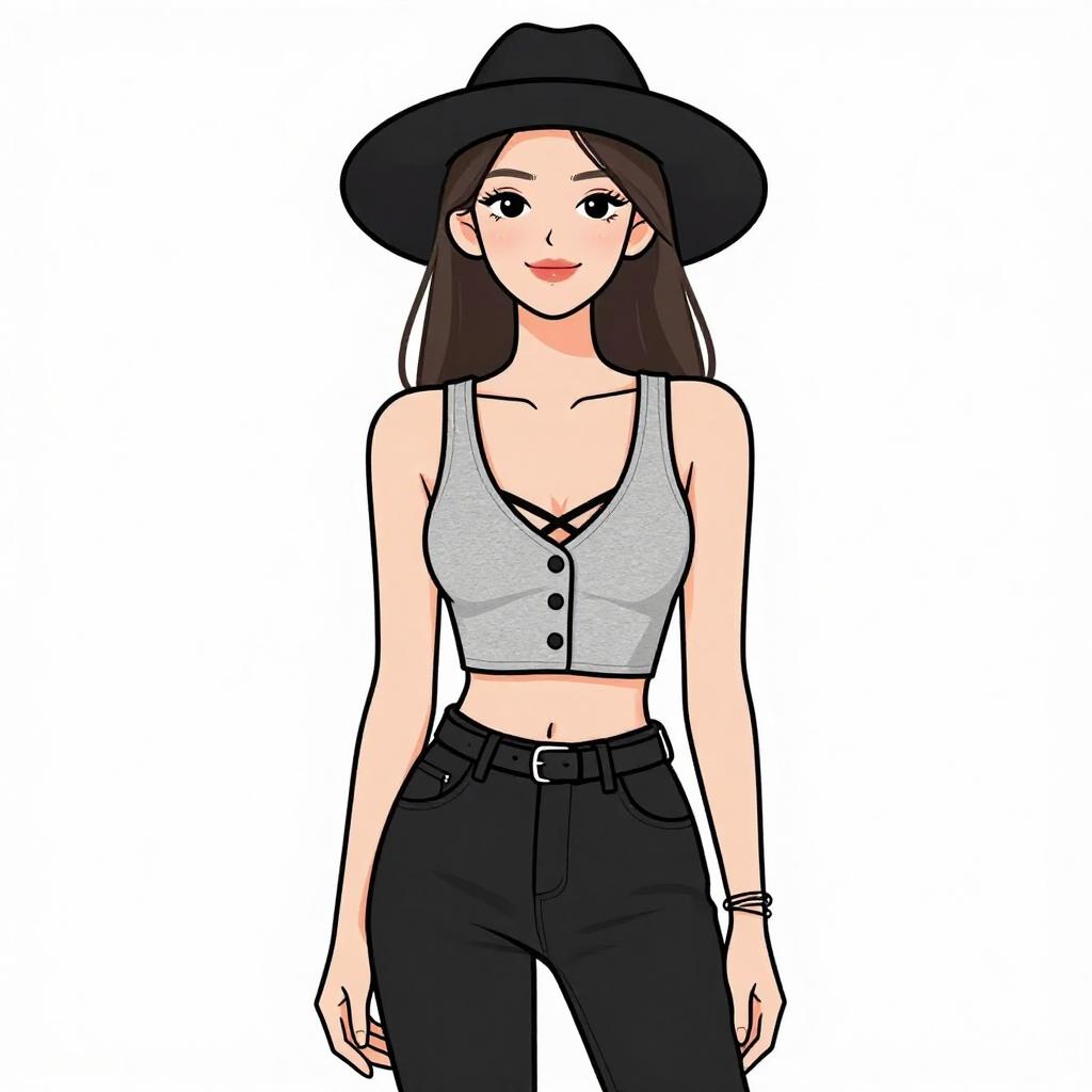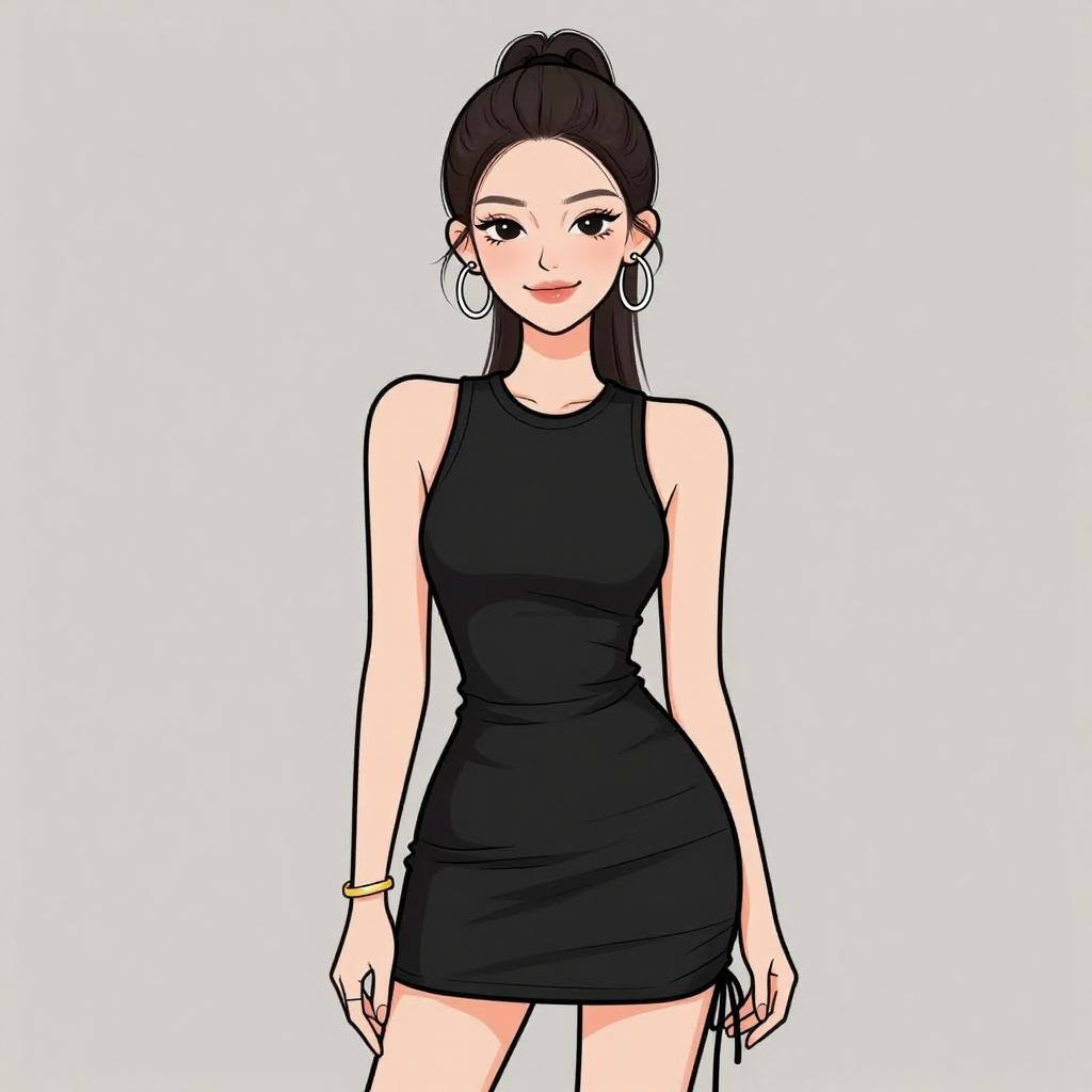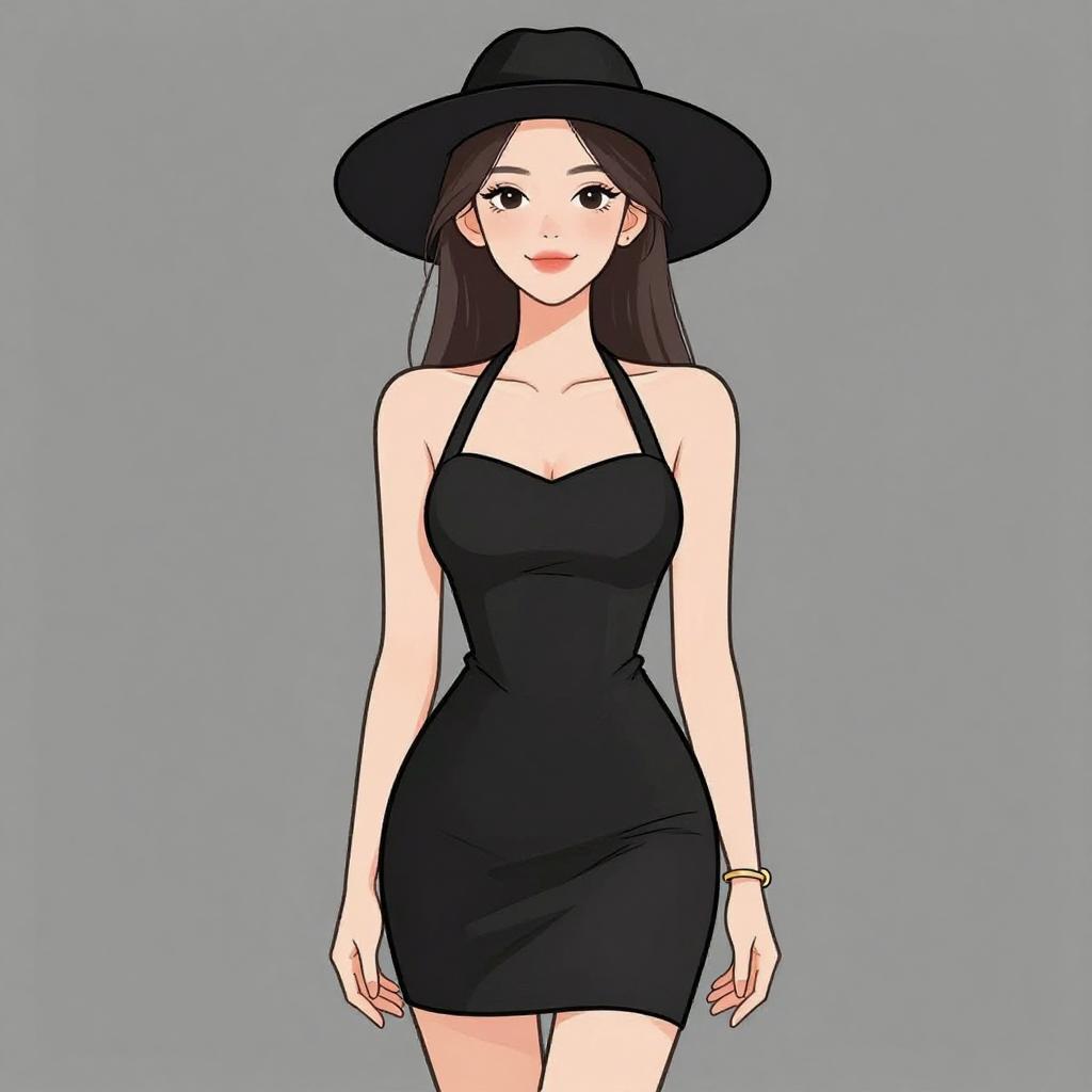 Woman with pretty face and pretty hair. smiling Woman, contemporary casual, black mini shift dress, halter-style neckline with strap details, sleeveless, relaxed fit, solid color, gold-tone bracelet, wide-brimmed black hat, dress fitting background. --sref 1467