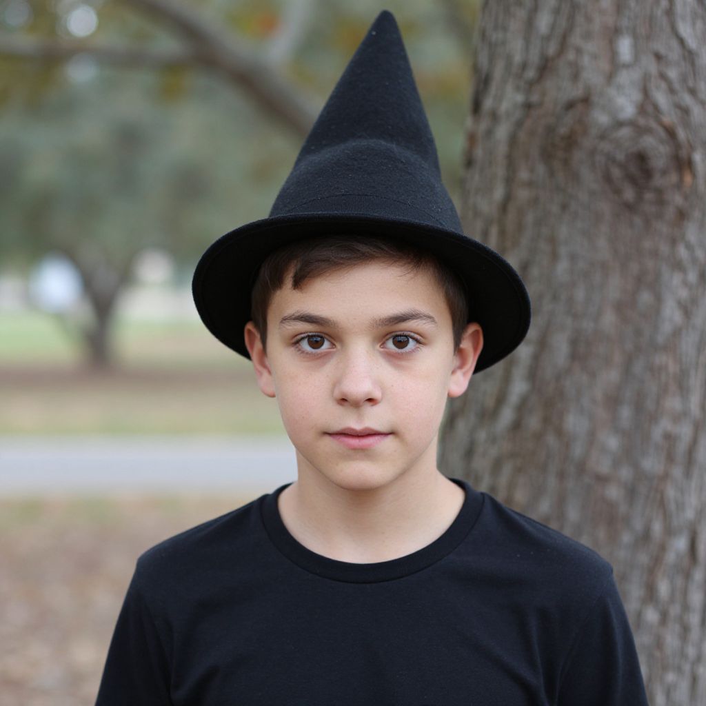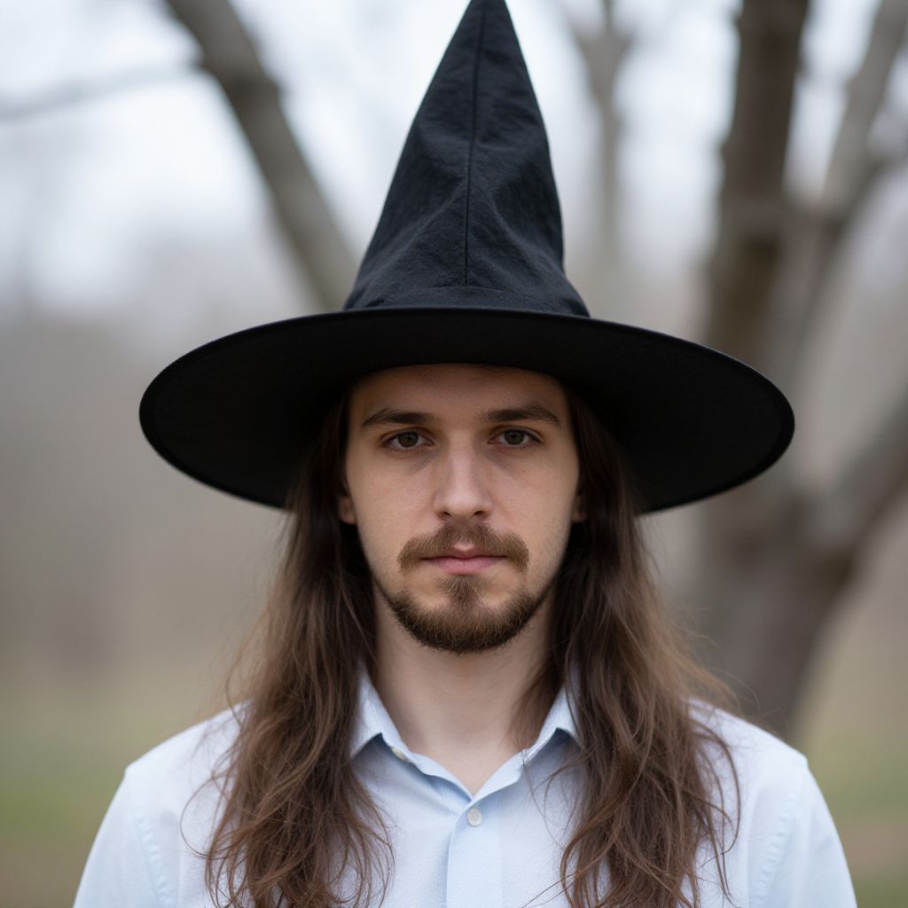 "man crazy halloween costume, 1boy, male focus, solo, hat, suspenders, shirt, looking at viewer, facial hair, mustache, outdoors, blurry background, realistic, orange shirt, blurry, witch hat, black hair Realistic photo of casual sexy person with pretty face"