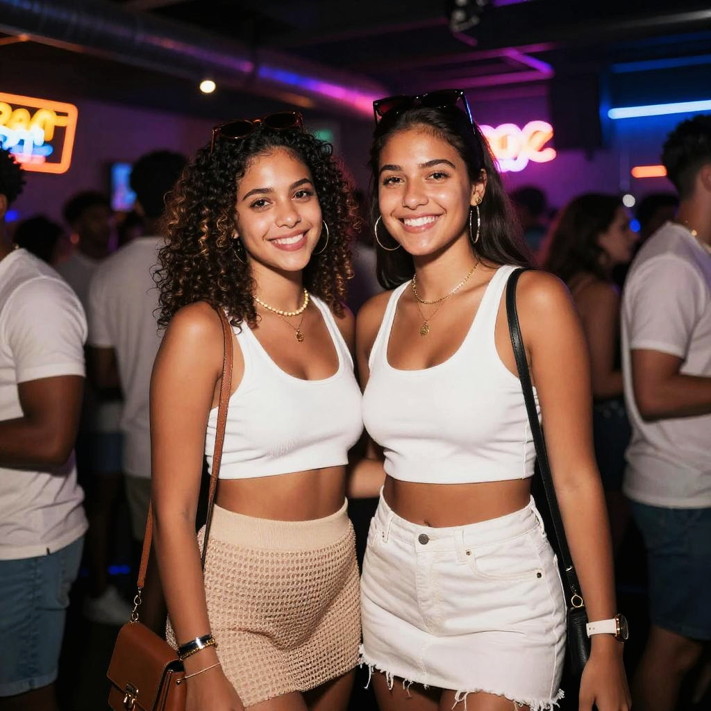 Two friends Miami nightlife neon lights bustling city streets stylish club attire energetic dynamic fun urban adventure