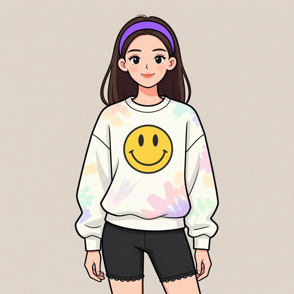 Digital illustration of a smiling young woman with long brown hair in a braid, wearing a pastel tie-dye sweater, white pants, and gray
