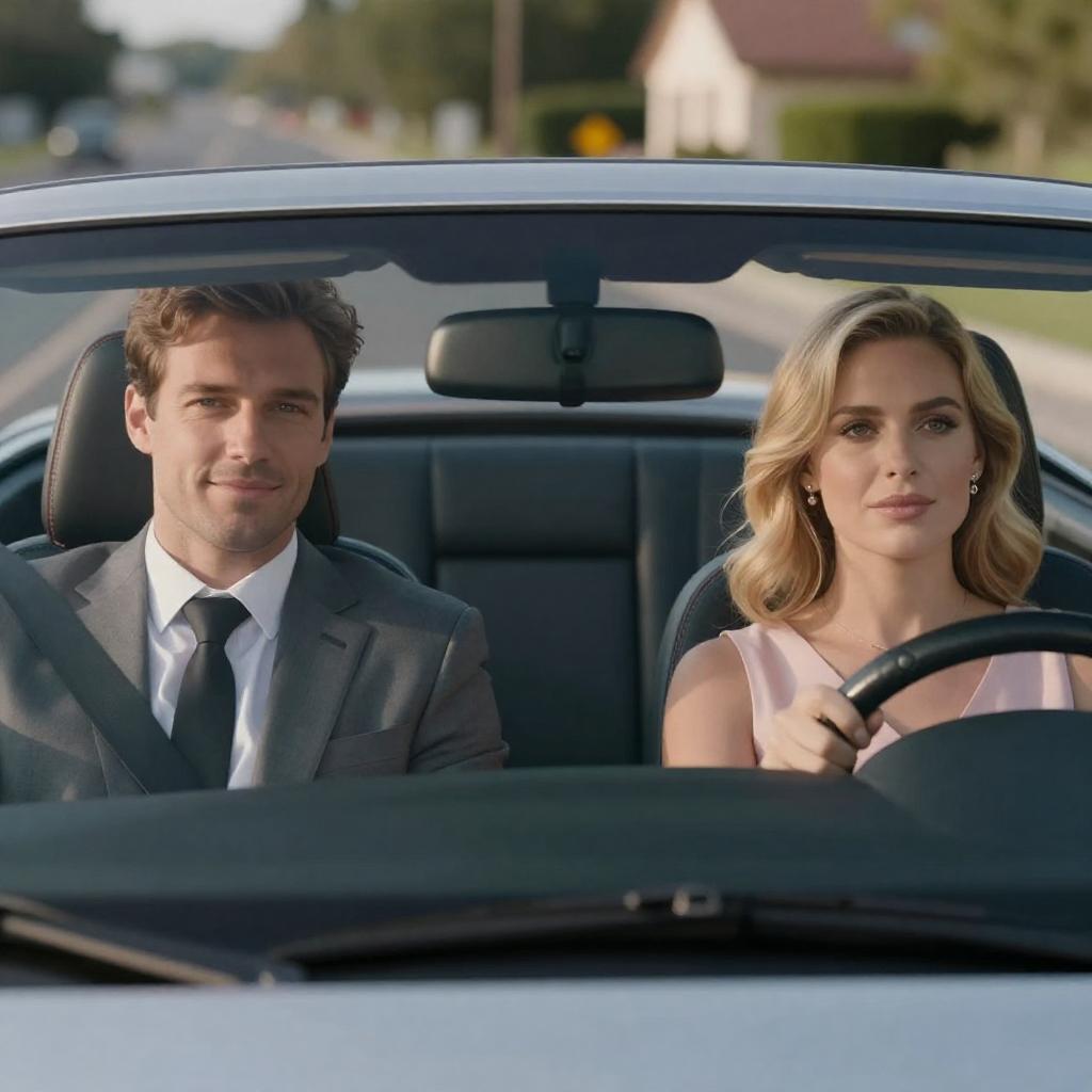 Photograph of a man with short dark hair, intense gaze, wearing a red shirt, gripping the steering wheel. Blonde woman with long hair, eyes closed, leaning on his shoulder, wearing pink top. White leather car seat, leopard print seat cushion. Background includes blurred cars and street. Man has ring on right hand.