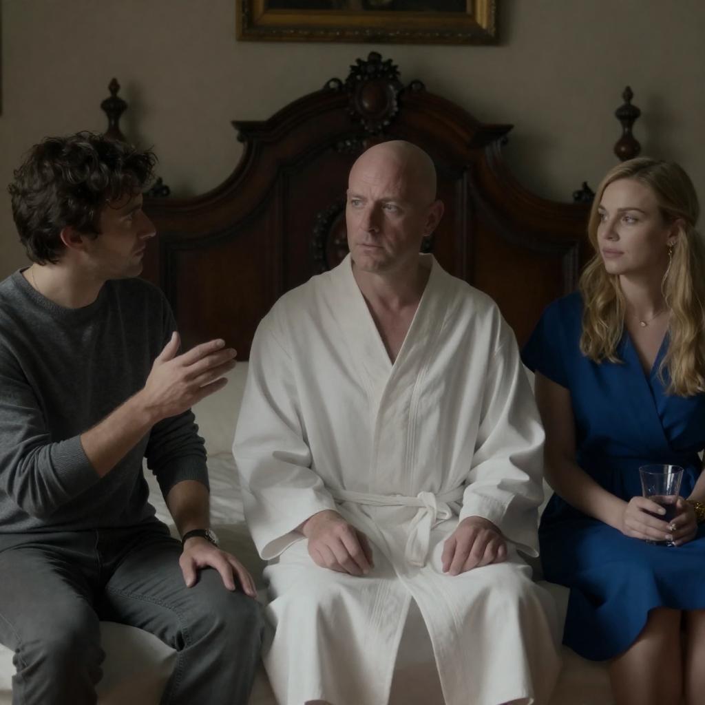 Photograph of a man with a shaved head and mustache, dressed in a white hospital gown, seated between a dark-haired man in a blue shirt and a blonde woman in a teal uniform. They are in a dimly lit room with dark wooden furniture and a fan in the background. The man looks forward, while the others look at him attentively.